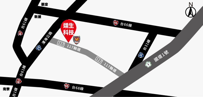 國一往南 → 接66往西走(觀音) → 接台15線左轉往南 → 萊爾富左轉縣道117 → 抵達翊生科技(1km)